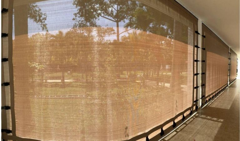 Malla de alta resistencia que reduce drásticamente la velocidad del viento y lluvia sin bloquear visibilidad ni ventilación.